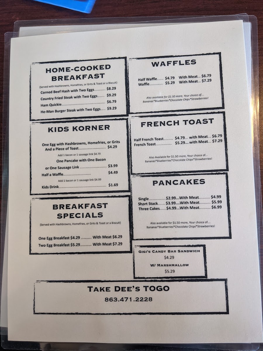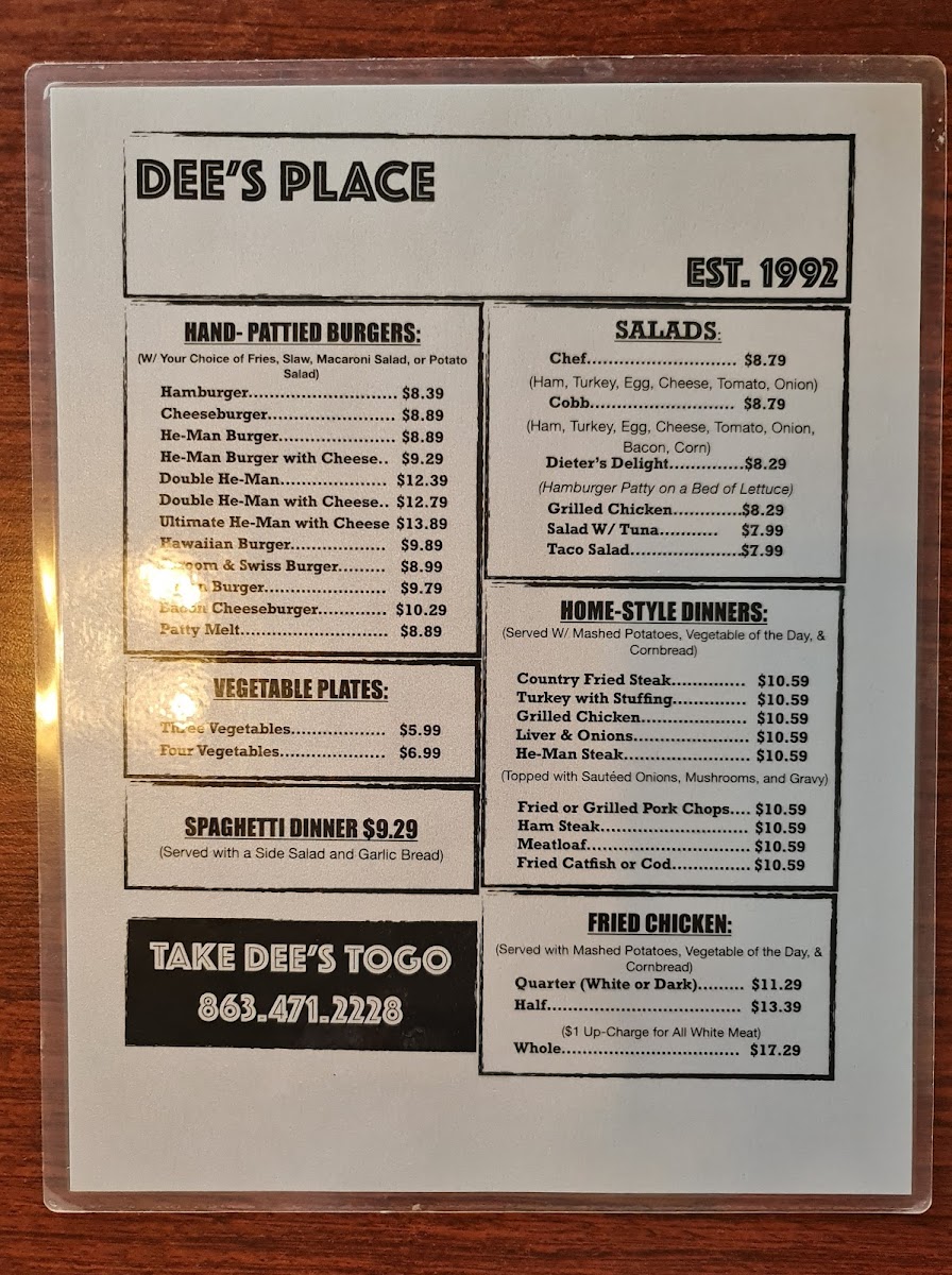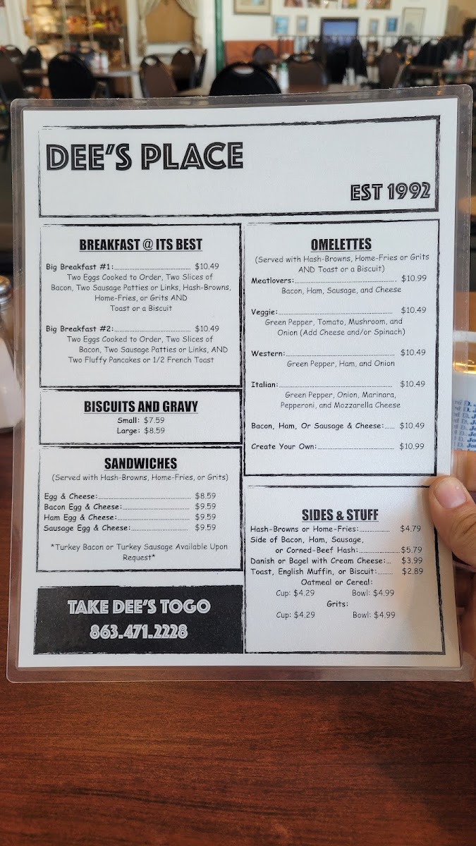 Welcome to Dee's Place, a cherished family-owned gem located at 138 N Ridgewood Dr, Sebring, FL. This delightful restaurant specializes in serving hearty breakfast and lunch options, all crafted with love and care. Here, you’ll find a menu that celebrates homemade goodness, featuring everything from savory country fried steak to juicy hand-pattied burgers.